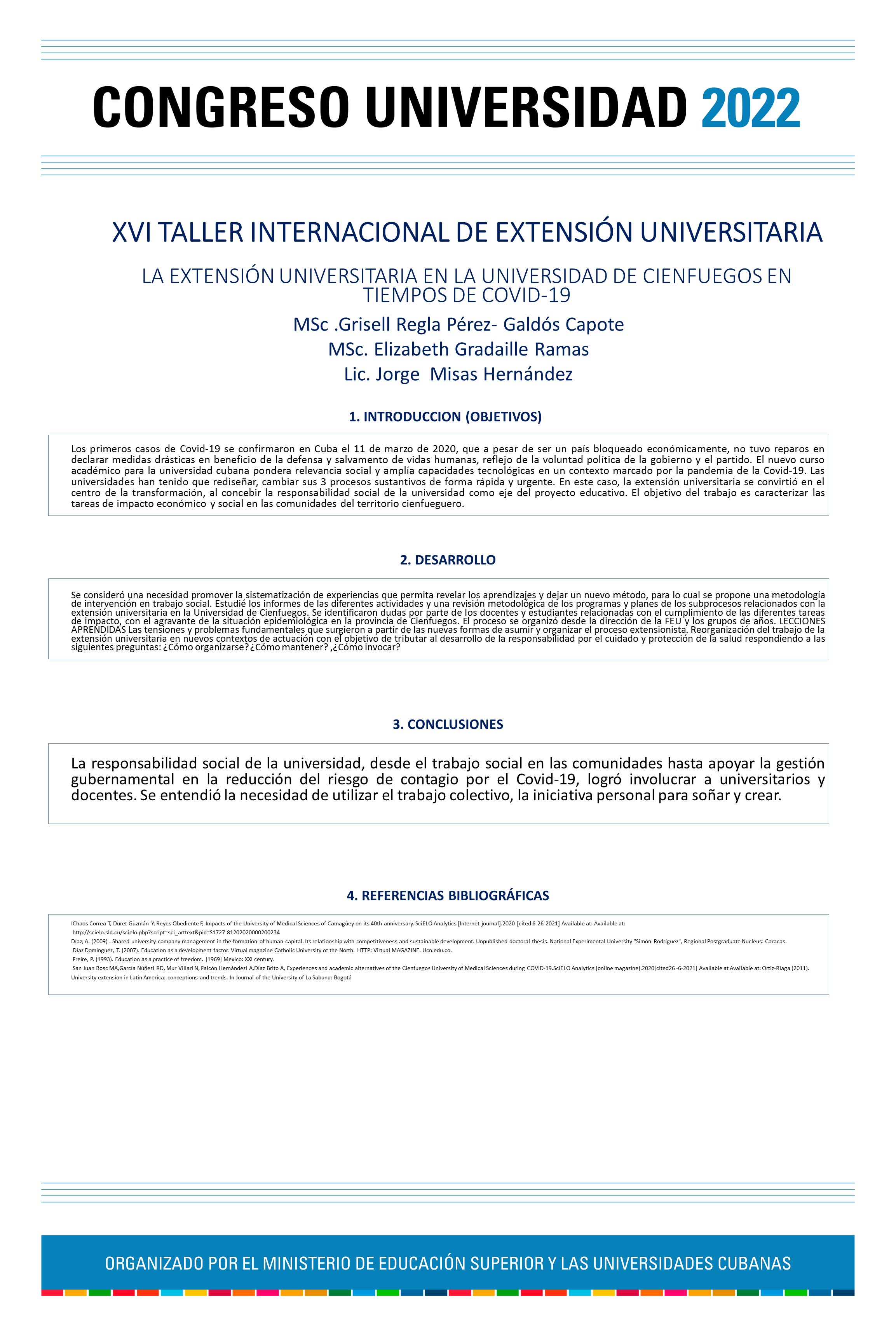 This work entitled university extension at the University of Cienfuegos in times of COVID-19 constitutes an expression of the relevance, social projection and contextualization in the educational and political-ideological work of this Higher Education Center. The main objective of the work is to characterize the tasks of economic-social impact in the communities of the Cienfuegos territory. Its preparation has been based on the experience of the work carried out under current conditions in the Municipal University Centers and in the Popular Councils of the municipality of Cienfuegos. In addition, the experience has been supported by the work of the professors who have participated in an integrated way with other institutions and organizations in the territory. The application of theoretical and empirical methods was required, such as; the observation, triangulation of information, the technique of discussion groups for the determination of the main potentialities and needs of university extension. This work shows the value of youth in their sensitivity, solidarity, showing the human quality and the satisfaction of fulfilling the call of the Revolution.